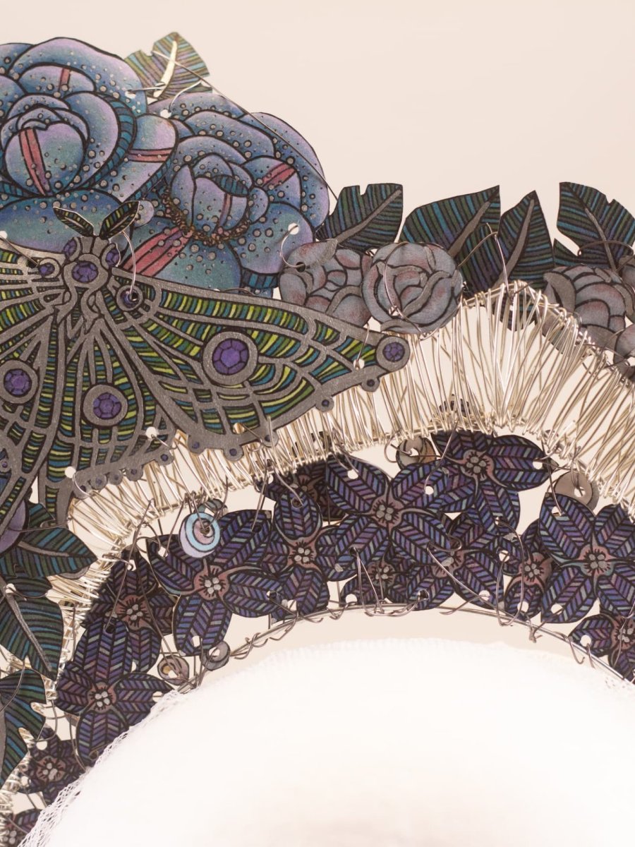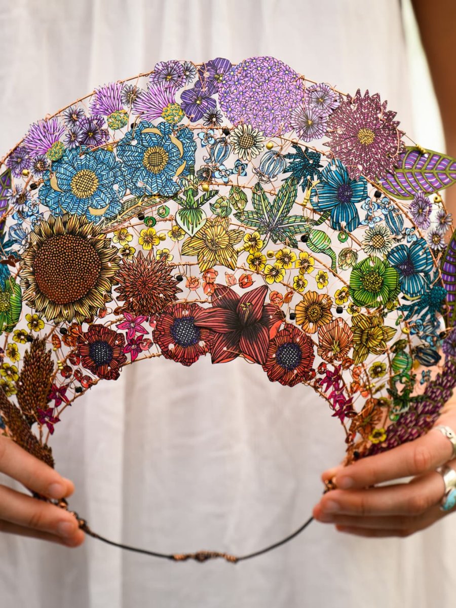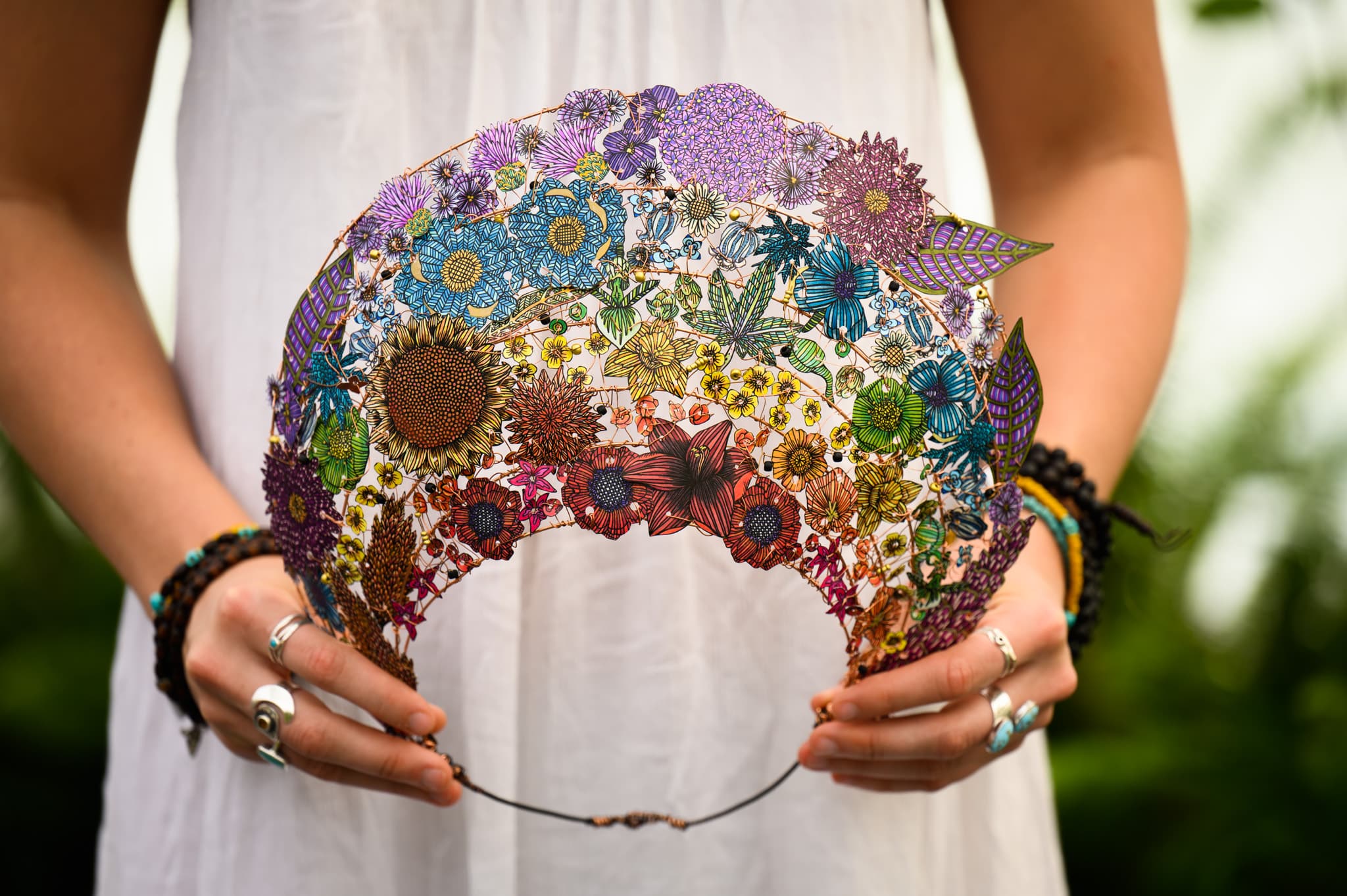 I work with all color palettes and floral arrangements, and have also made mermaid crowns, rainbow crowns, and anything else you can imagine. Each crown is made with copper (if gold) and stainless steele (if silver). I use acid free bristol board for the illustrated elements, and use a G2 Pilot Pen with copic and prisma markers as well as Posca gold markers. Finally, I really love to add beading for a bit of sparkle.